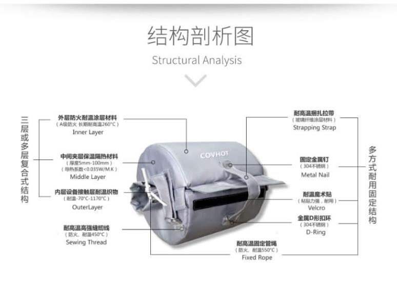 中間層為保溫棉填充層,起保溫隔熱的作用。根據(jù)不同的使用場景,一般選擇導熱系數(shù)低,憎水性好的保溫材料。在特定情況下,我們也會使用多種填充材料相結合的方案來確保我們的保溫套(衣)符合設備的需求。
